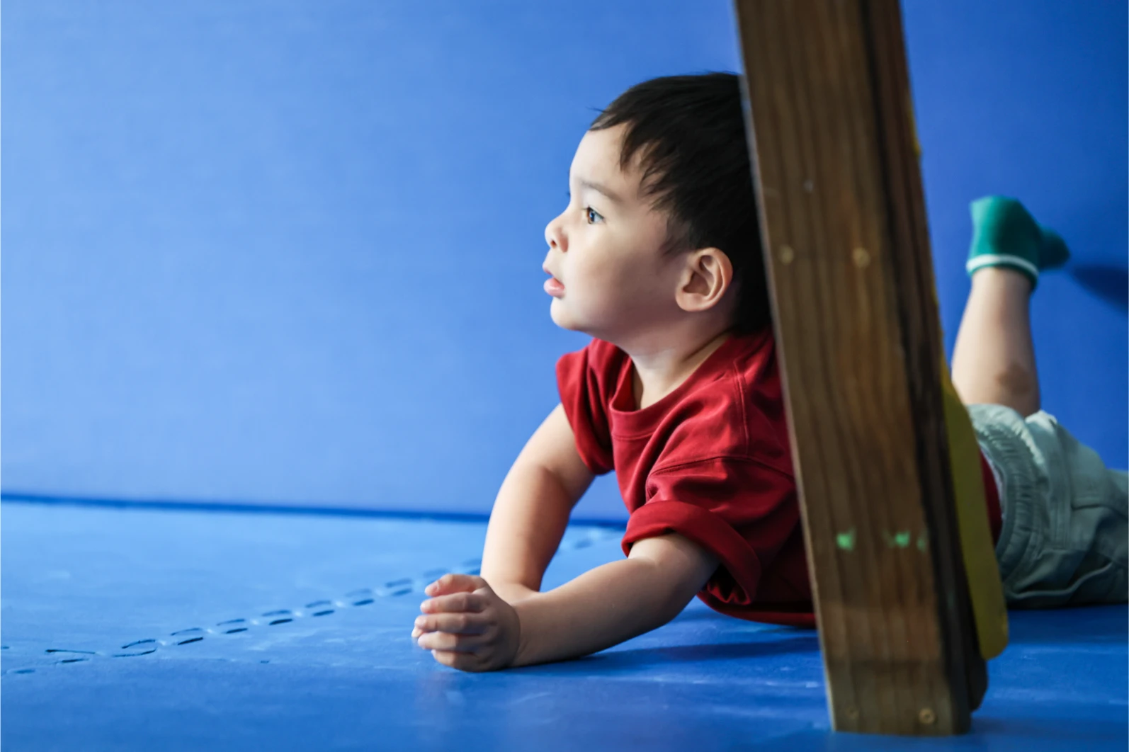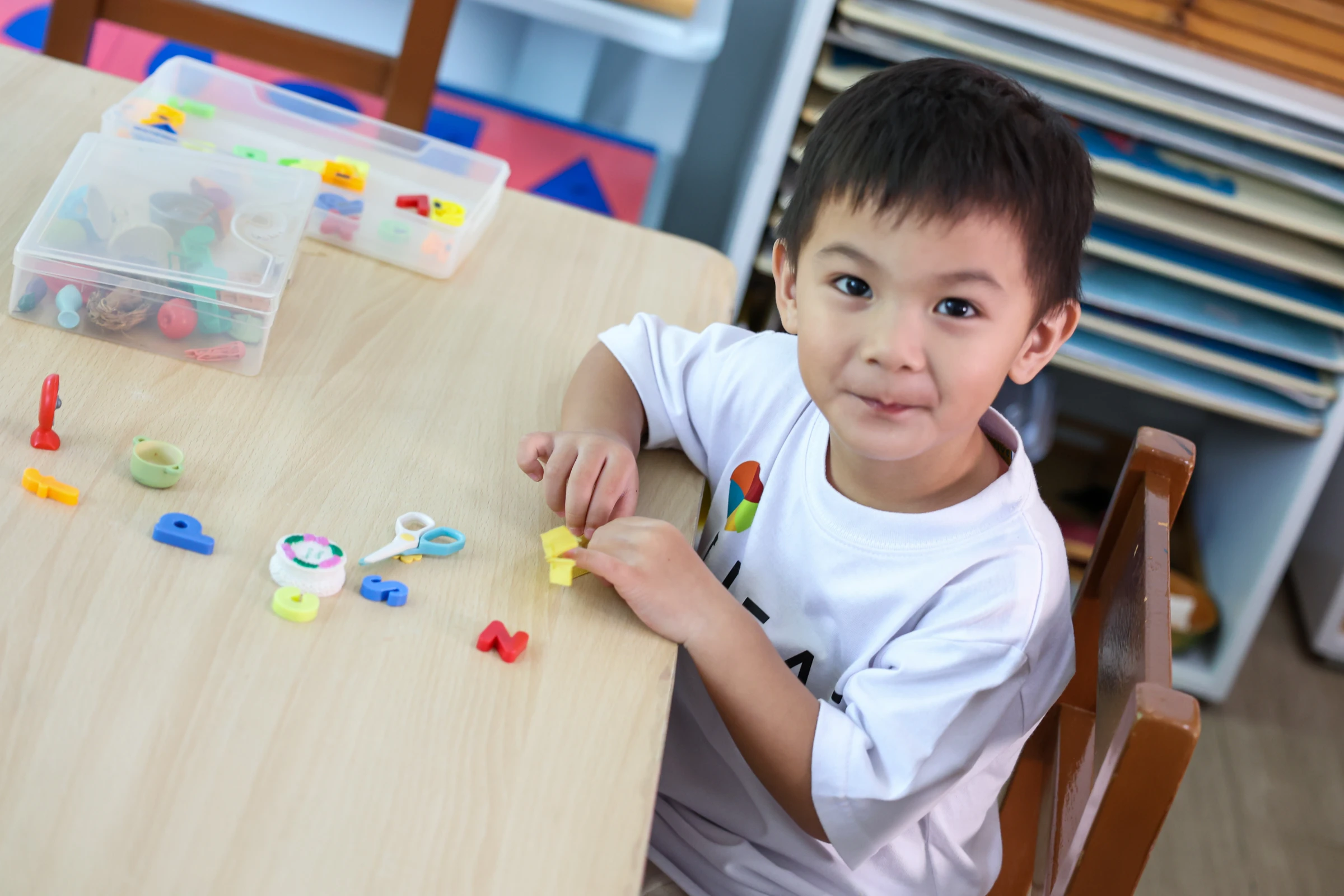 Young boy sitting at a table smiling with a wooden tray holding blue blocks and a brown bowl in front of him.