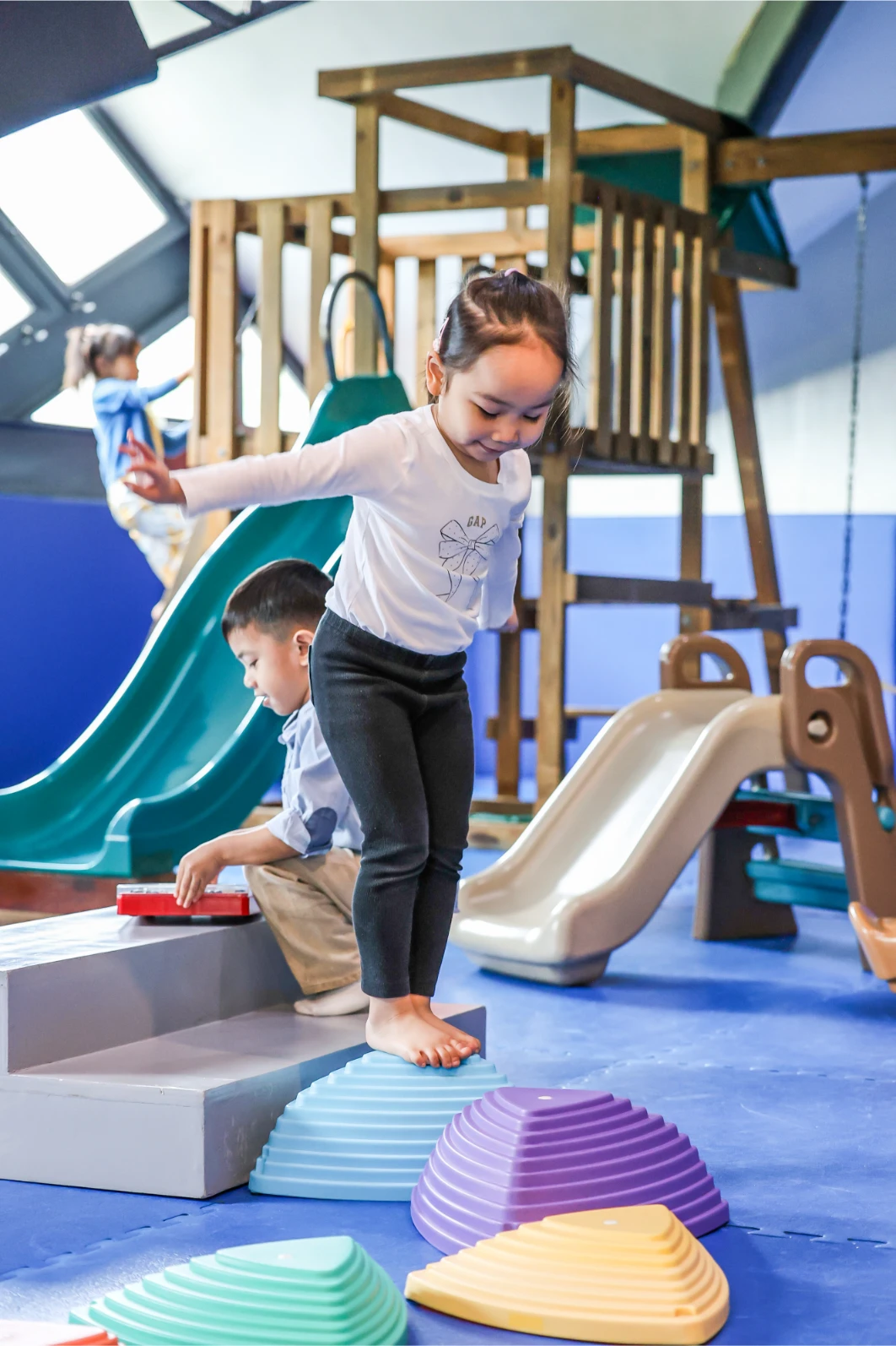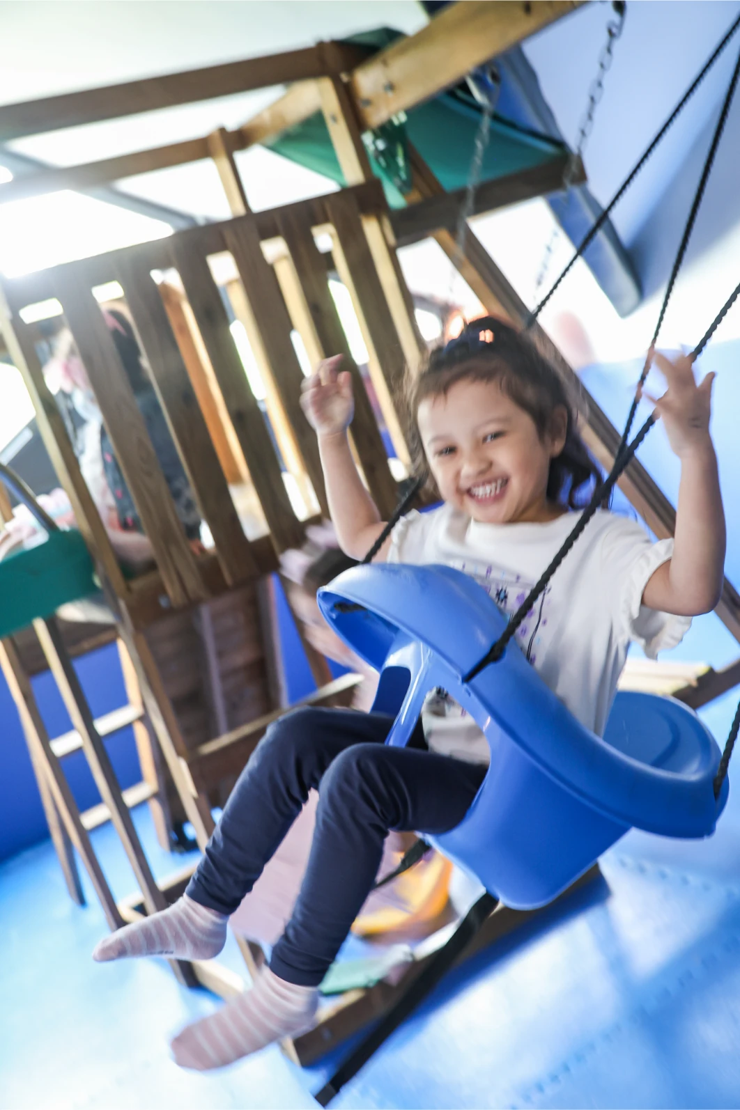 Indoor children's playroom with blue padded floor, wooden swing set, slide, ball pit, and toys under a slanted roof with windows.